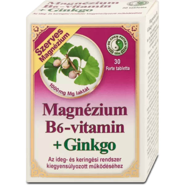 A Dr. Chen Magnézium B6-vitamin + Ginkgo Forte tabletta hatékony kombinációja a magnéziumnak, B6-vitaminnak és ginkgo biloba kivonatnak, melyek együttesen támogatják az idegrendszer kiegyensúlyozott működését.