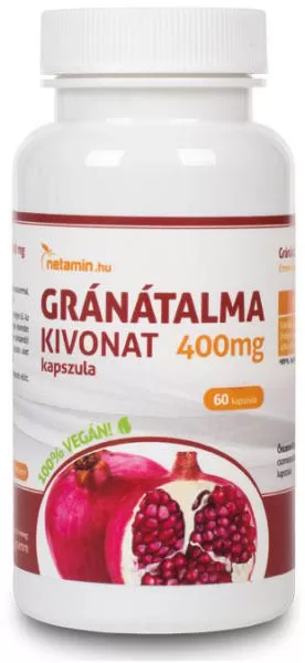 A Netamin Gránátalma-kivonat napi adagja 400 mg gránátalma-kivonatot tartalmaz, 40% polifenol tartalomra standardizálva. Szedésével a gránátalma jótékony hatásait gyors, kényelmes módon élvezheted, anélkül hogy a gyümölcsből minden nap nagy mennyiséget elkéne fogyasztanod.
